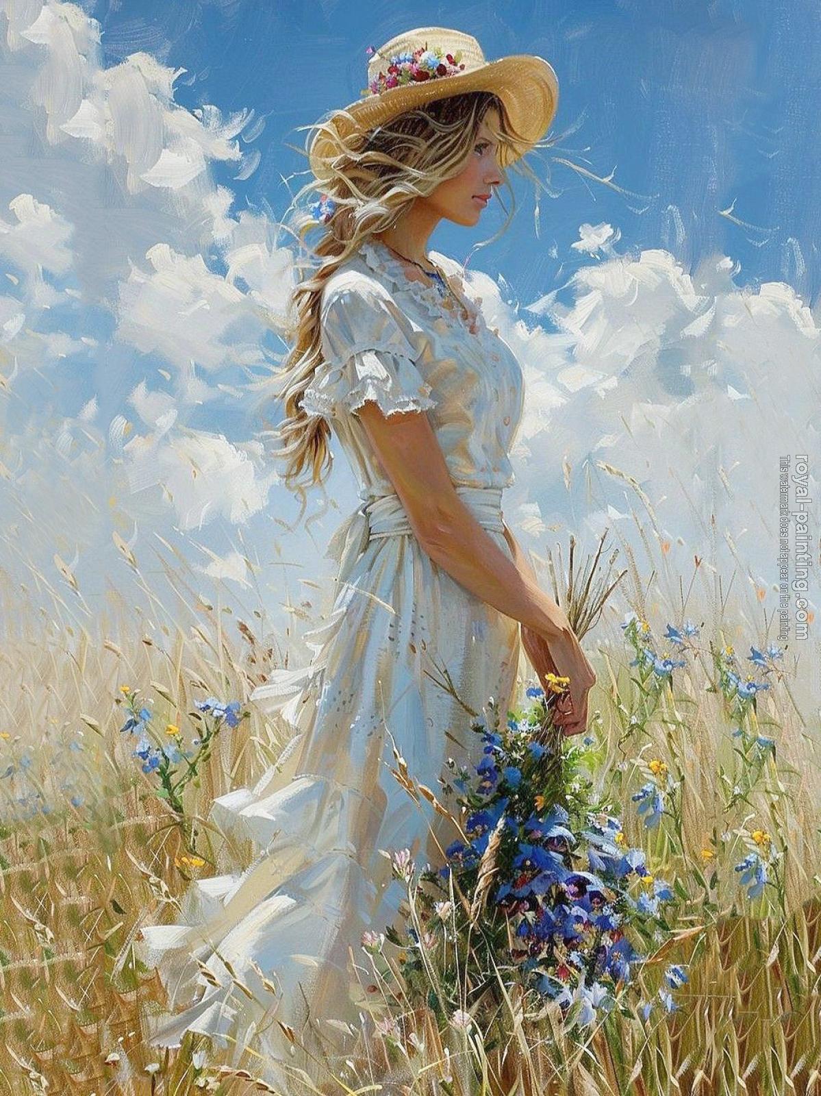 The girl wearing a hat, a white dress, and a bouquet of flowers is in the grass AI oil painting