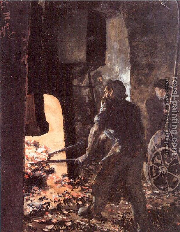* Hand-painted Adolph Von Menzel Oil Painting Reproduction : Self-Portrait with Worker near the Steam-hammer