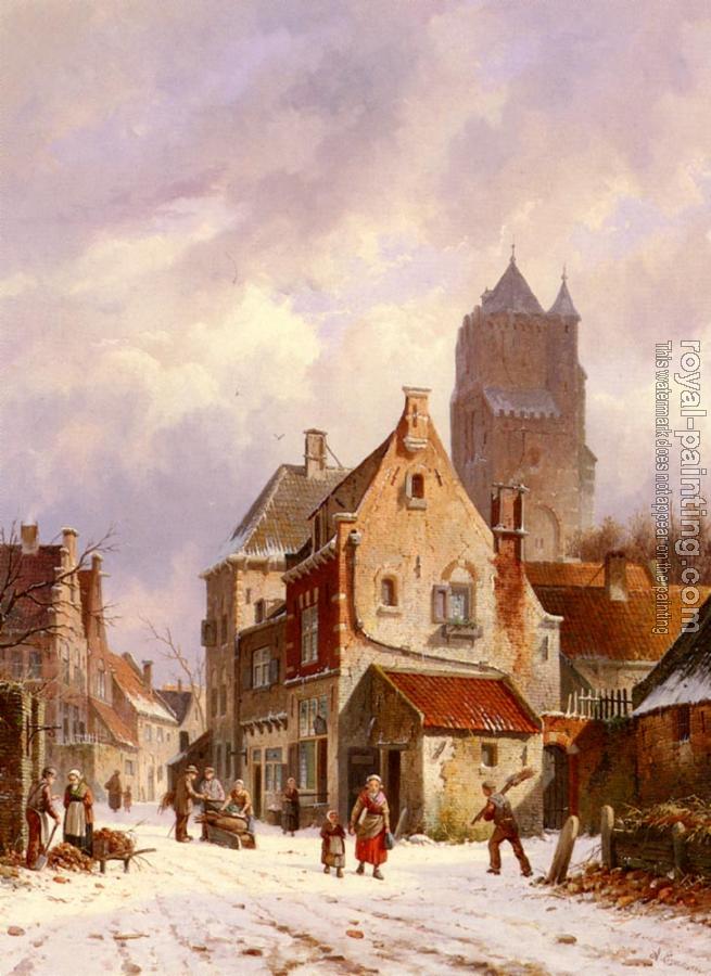 * Hand-painted Adrianus Eversen Oil Painting Reproduction : A Winter Street Scene