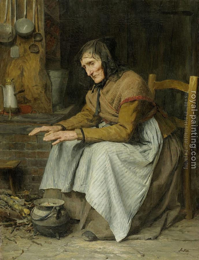 * Hand-painted Albert Anker Oil Painting Reproduction : Hohes alter (alte frau sich aufw rmend)