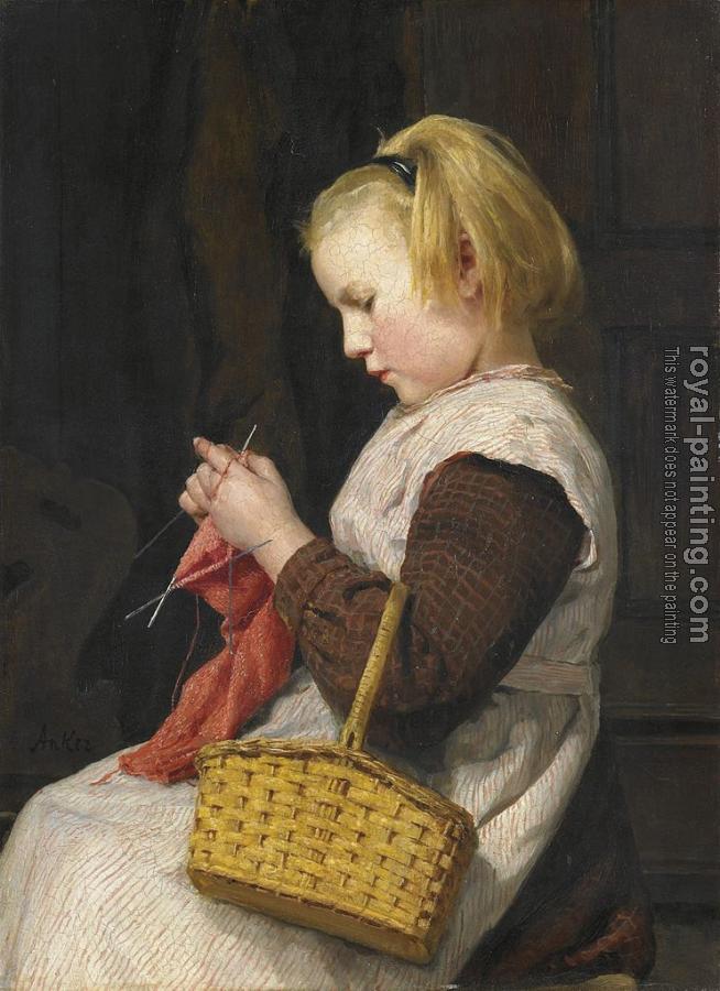 * Hand-painted Albert Anker Oil Painting Reproduction : Strickendes madchen mit korb