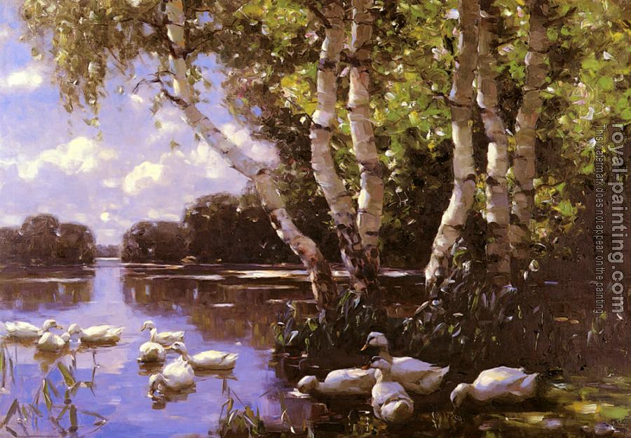 * Hand-painted Alexander Koester Oil Painting Reproduction : Elf Enten Unter Birken Und Im Wasser