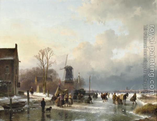 * Hand-painted Andreas Schelfhout Oil Painting Reproduction : An extensive winter landscape with numerous villagers on the ice