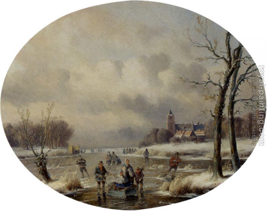 Skaters On A Frozen Waterway, A 'Koek En Zopie' In The Distance by Carl Eduard Ahrendts