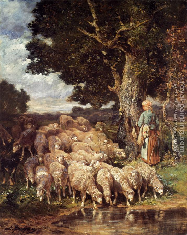A Shepherdess with her Flock near a Stream by Charles Emile Jacque