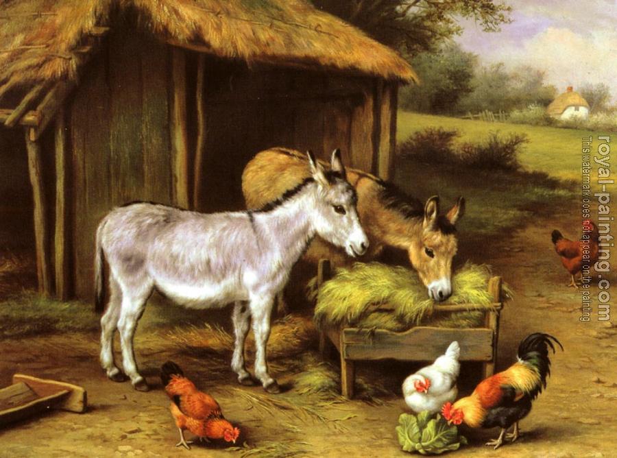 Chickens And Donkeys Feeding Outside A Barn by Edgar Hunt