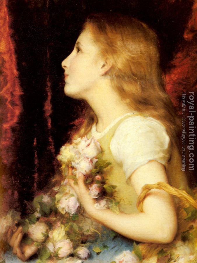 A Young Girl with a Basket of Flowers by Etienne Adolphe Piot