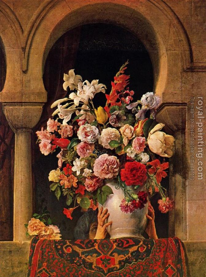 * Hand-painted Francesco Hayez Oil Painting Reproduction : Vase of Flowers on the Window of a Harem