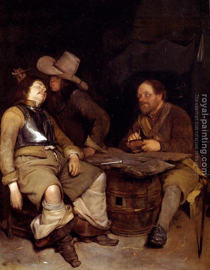* Hand-painted Gerard Ter Borch Oil Painting Reproduction : A Guard Room Interior With A Soldier Blowing Smoke In The Face Of His Sleeping