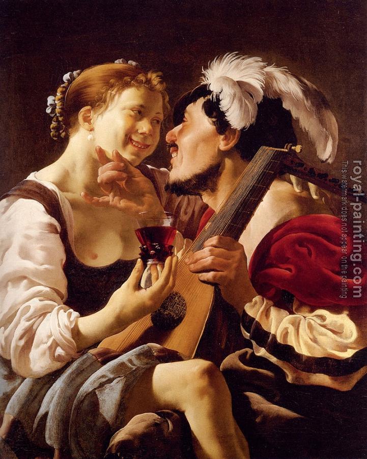 A Luteplayer Carousing With A Young Woman Holding A Roemer by Hendrick Terbrugghen