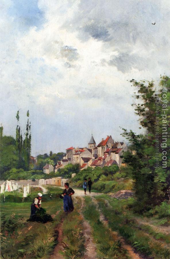 Washer Women On A Study Track With A Village Beyond by Henri-Joseph Harpignies
