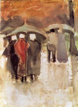 Scheveningen women and other people under umbrellas