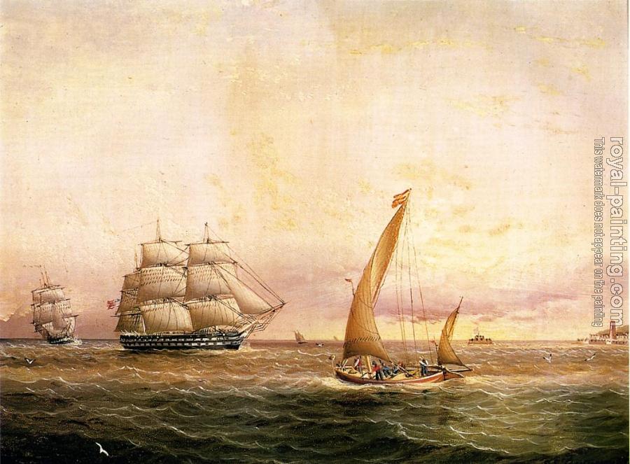 * Hand-painted James E Buttersworth Oil Painting Reproduction : Two American Naval Vessels Entering Harbor