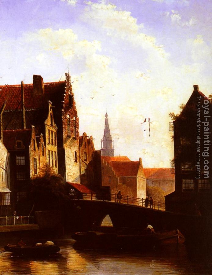 * Hand-painted Jan Jacob Coenraad Spohler Oil Painting Reproduction : Figures on a bridge in a Dutch Town Part