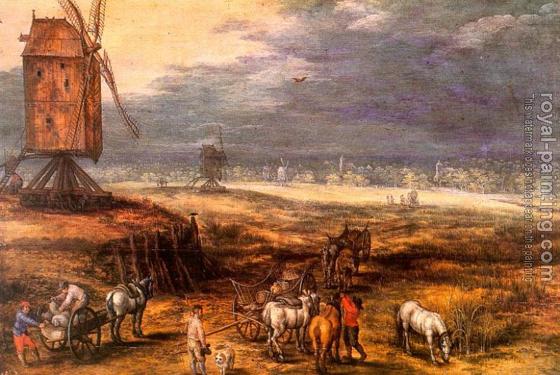 * Hand-painted Jan The Elder Brueghel Oil Painting Reproduction : Landscape with Windmills