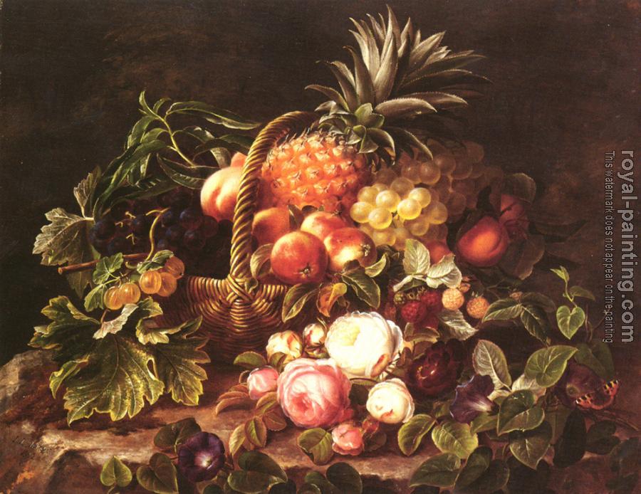 A Still Life Of A Basket Of Fruit And Roses by Johan Laurentz Jensen