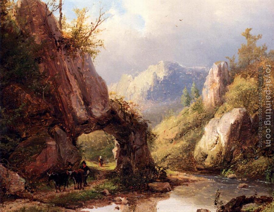 A Mountain Valley With A Peasant And Cattle Passing Along A Stream by Johann Bernard Klombeck