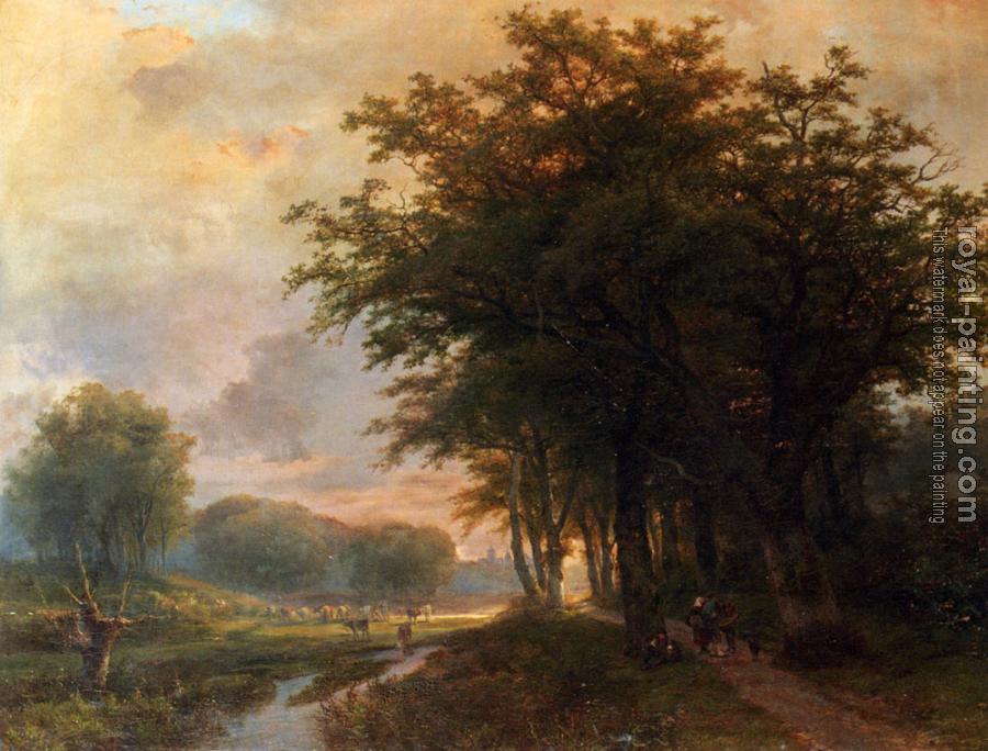 * Hand-painted Johann Bernard Klombeck Oil Painting Reproduction : A Wooded River Valley With Peasants On A Path