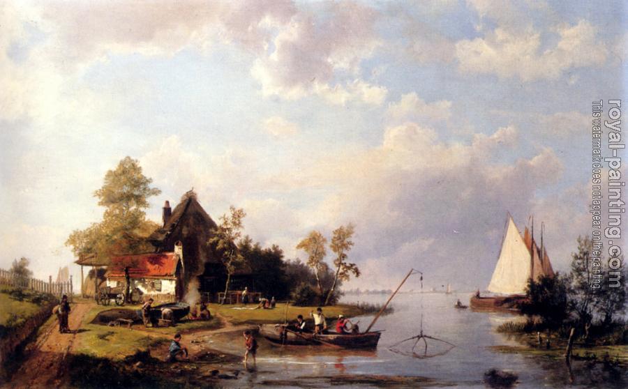A River Landscape With A Ferry And Figures Mending A Boat by Johannes Hermanus Koekkoek