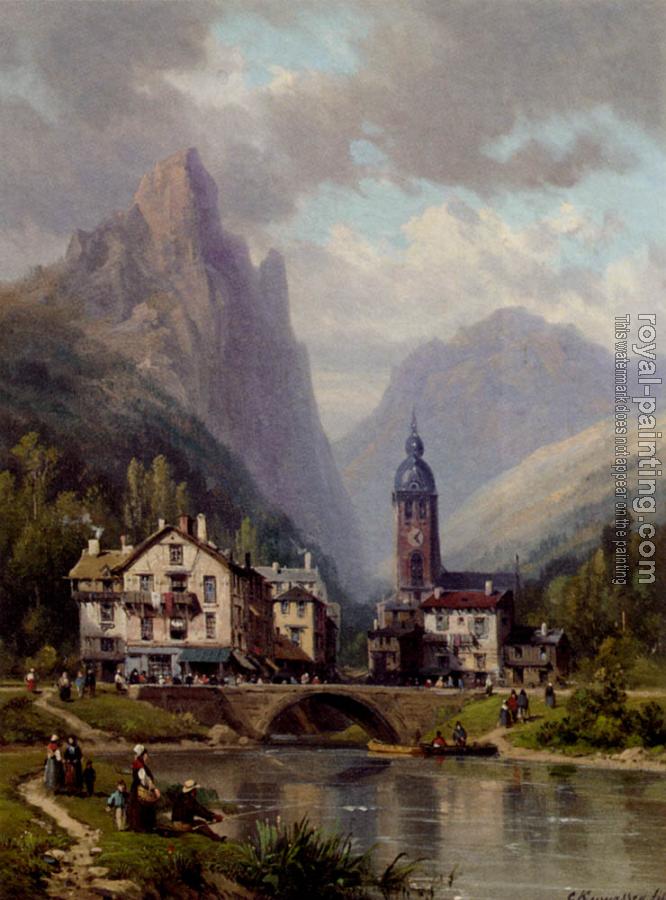 * Hand-painted Jr Charles Euphrasie Kuwasseg Oil Painting Reproduction : An Agler Before An Alpine Riverside Town