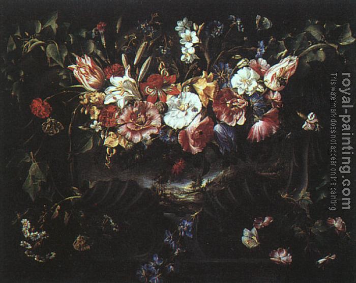* Hand-painted Juan De Arellano Oil Painting Reproduction : Graphic Garland of Flowers with Landscape