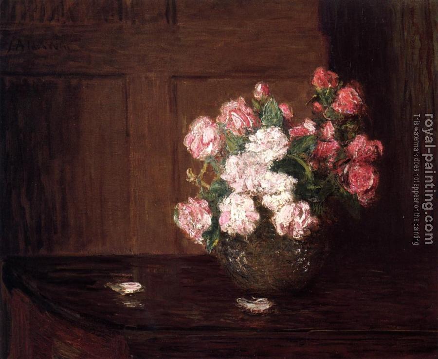 Weir, Julian Alden oil painting, ID , 31144-Weir, Julian Alden-Roses in a Silver Bowl on a Mahogany Table