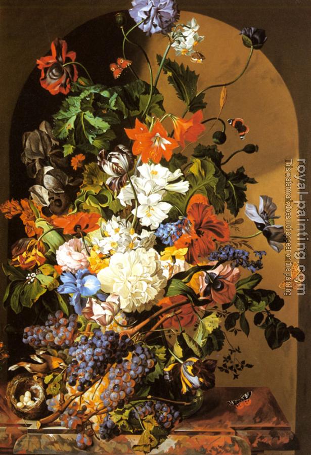 A Still Life with Flowers and Grapes by Leopold Zinnogger