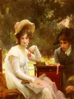 Marcus Stone (1840-1921), English painter, son of Frank Stone, ARA, was trained by his father and began to exhibit at the Academy before he was eighteen; and a few years later he illustrated with much success books by Charles Dickens, Anthony Trollope, and other writers, friends of his family. He was elected an associate of the Royal Academy in 1877, and academician in 1887. In his earlier pictures he dealt much with historical incidents, but in his later work he occupied himself chiefly with a particular type of dainty sentiment, treated with much charm, refinement and executive skill. One of his canvases is in the National Gallery of British Art. Most of his works have been engraved, and medals have been awarded to him at exhibitions in all parts of the world.