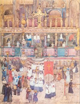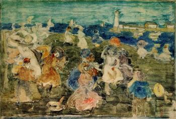 Maurice Brazil Prendergast (1859-1924) was an American painter, born in Boston, and trained in art as a painter of advertising placards in Boston and later in France and Italy. He returned to Boston in 1900. Prendergast was a member of The Eight, a group of artists led by Robert Henri. The group had an influential exhibition in 1908; they broke with the academic tradition that reigned at the time and proposed that painting be connected to everyday life. In 1914 he moved to New York City, where he spent the remainder of his life. His work is characterized by rich, powerful color applied in dots and in short brushstrokes. Many of his subjects are landscapes with figures, as for example, Central Park (1901, Whitney Museum, New York City). A number are of the seashore. Others include Boston street scenes and sketches of Neapolitan and Venetian life.
