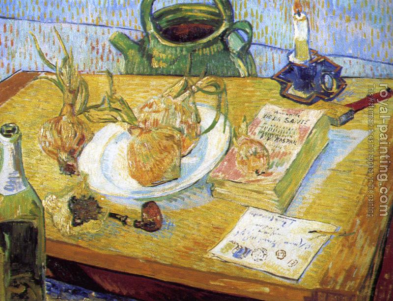 * Hand-painted Vincent Van Gogh Oil Painting Reproduction : Plate with onions, annuaire de la sante and other objects