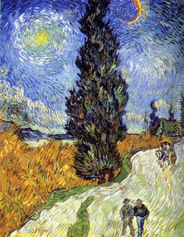 * Hand-painted Vincent Van Gogh Oil Painting Reproduction : Road with Men Walking, Carriage, Cypress, Star, and Crescent Moon II