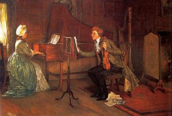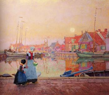 A Dutch Fishing village At Dusk With Figures On A Quay