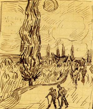 Road with Men Walking, Carriage, Cypress, Star, and Crescent Moon II