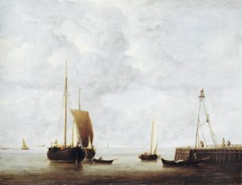 A Dutch Hoeker at Anchor near a Pier
